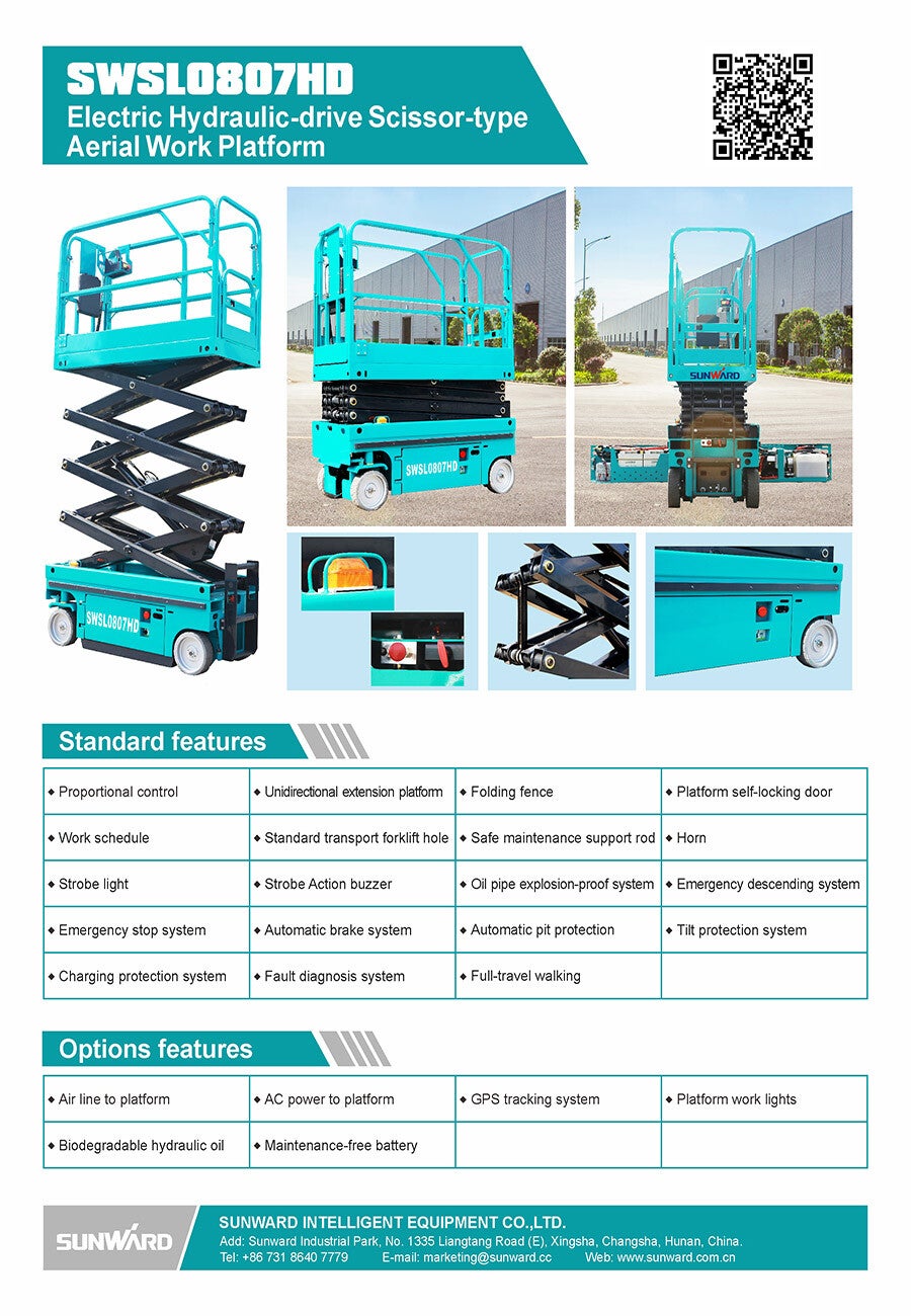 La nacelle Sunward SWSL 0807HD est dotée d’un entraînement hydraulique, la rendant durable et économique. Malgré sa taille très compacte, elle est très puissante. Comme tous les modèles de nacelles ciseaux Sunward, elle offre d’excellentes performances, une utilisation confortable et sûre et ne nécessite quasiment pas de maintenance. Grâce à sa taille, elle se transport facilement sur n’importe quel site d’intervention et, grâce à son taux d’émissions zéro, elle peut être utilisée à l’intérieur comme à l’extérieur.
